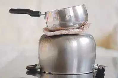 取一个钢锅倒置在桌面,锅底朝天